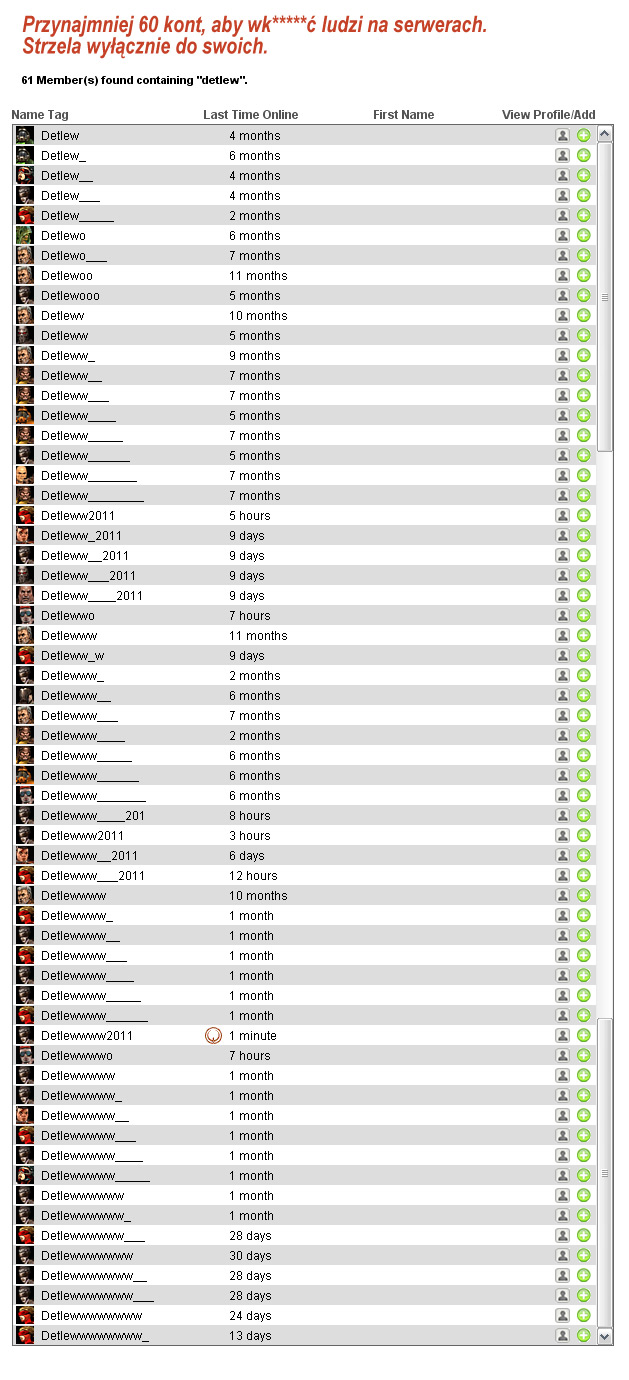 och, dajcie spokoj. Gosciu mnie osobiscie kiedys wkurzal, teraz przyprawia mnie o smiech. Najlepszym sposobem na pozbycie sie go to robienie tego samego co on. Tk i po kilku minutach wyjdzie. Najlepsze jest to, ze gosciu jest z polski o ile sie orientuje pomimo tego, ze zawsze mial niemiecka flage w profilu (tak, teraz sobie przypomnialem, ze flagi sa automatycznie przydzielane i sprawdzilem w jego profilu i ma polska flage). Mozna tez mu nawrzucac i tez zwieje po chwili. Ja bym sie bardziej zastanowil nad tym czy to jest 1 gosciu czy moze to jakas zorganizowana akcja niz jak sie go pozbyc. Bo obecnosc takich elementow powinna wymusic na id mozliwosc banowania nie za pomoca ip tylko jakos po mac adresie i innych unikatowych numerach zeby wykurzyc drania na stale.