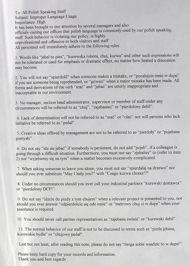 Zarazem jednak na maksa zalosne.W jakiejsc Angielskiej firmie maja zbyt wielu polakow a ci wprowadzili sobie polski do uzytku i wyzywaja kazdego jak leci gdy im sie cos nie podoba bo stwierdzaja ze i tak nie zrozumie. Takie postepowanie naszych rodakow jest juz znane chyba na calym swiecie ale to wcale nie swiadczy ladnie o nas...