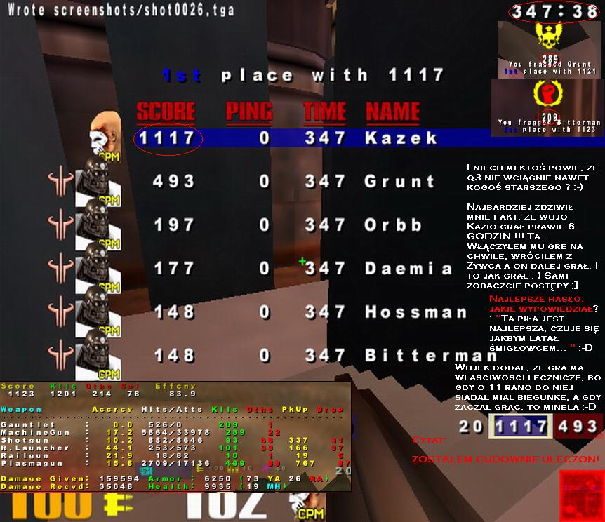l1nk : normalnie :) Jak zaczal grac, to powiedzialem mu, ze ma limit "20 zabic" i powiedzial, zebym to zmienil. A na ffa sa jakies takie bugi, ze jak dalem "fraglimit 0", to po prostu przy wynikach "dwudziestka" nie zniknela ;) a fraglimit 0 pozostal, nie miales nigdy czegos takiego?