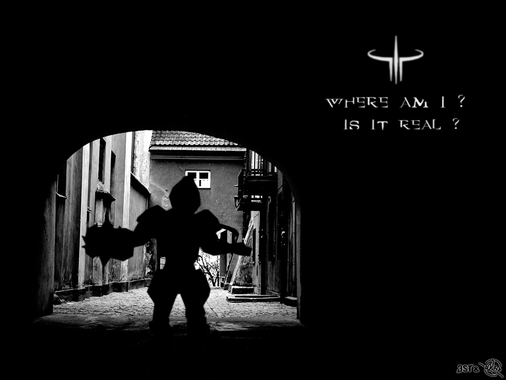 dobre, fajny pomysl z polaczeniem fotki (btw: skad wytrzasneliscie takie slumsy? :D) i postaci ze swiata q3. No i ta forma - czarno-biala fotka + cien postaci - mysle, ze jesli byloby to zrobione w inny sposob, wygladaloby juz tandetnie i nie trzymalo sie tak.. kupy.